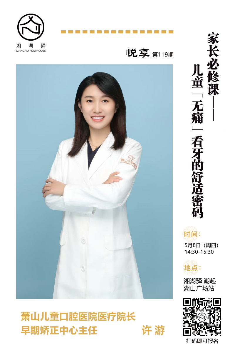 湘湖驿·悦享第119期将邀请杭州萧山儿童口腔医院医疗院长许游,带来主题“儿童‘无痛’看牙的舒适密码”的分享。